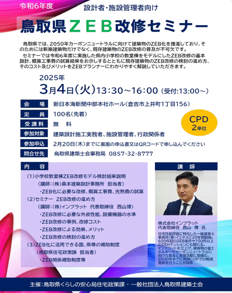 今月のブログは、3月4日に鳥取県で行われます「鳥取県ZEB改修セミナー」のご案内です。