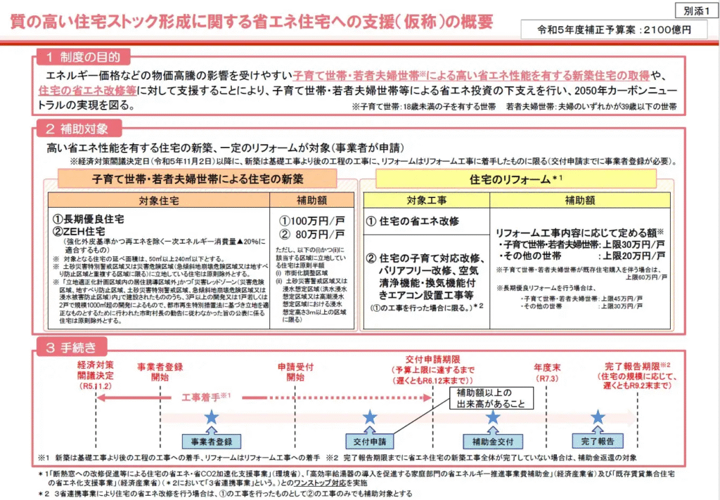 令和5年11月2日以降に対象工事(新築:基礎工事より後の工程の工事)に着手したものを対象とする。