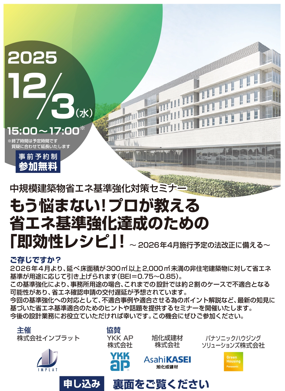 ご協賛のもと、中規模建築物省エネ基準強化対策セミナーを開催させて頂きます。